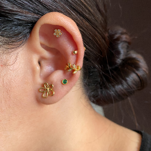 Piercing flor mediana con broche de rosca trasero. su barra es delgada con un grosor similar a un arete normal.
